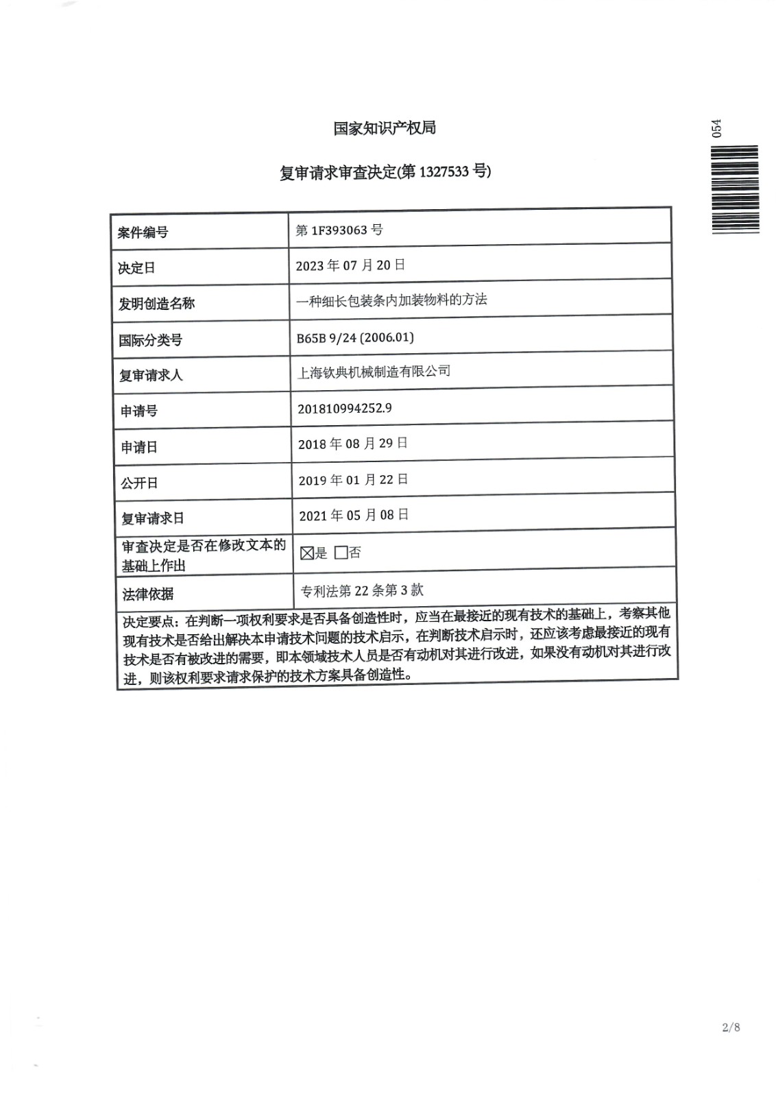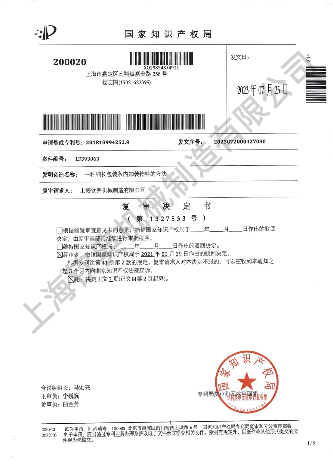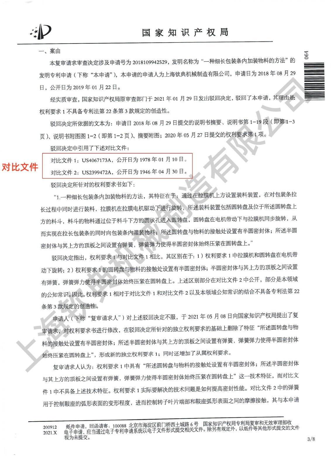我司從2018年提出該項專利申請,于2023年10月份歷時五年終獲通過,實屬不易!該專利是在1946和1978年美國雜志發(fā)表過同樣觀點被二次駁回,此項發(fā)明專利通過難度極大,經(jīng)過公司反復(fù)論證修改,獲得了一種細(xì)長包裝條內(nèi)加裝物料的方法,是包裝領(lǐng)域的一項突破性創(chuàng)新,已獲得國際專利認(rèn)證。