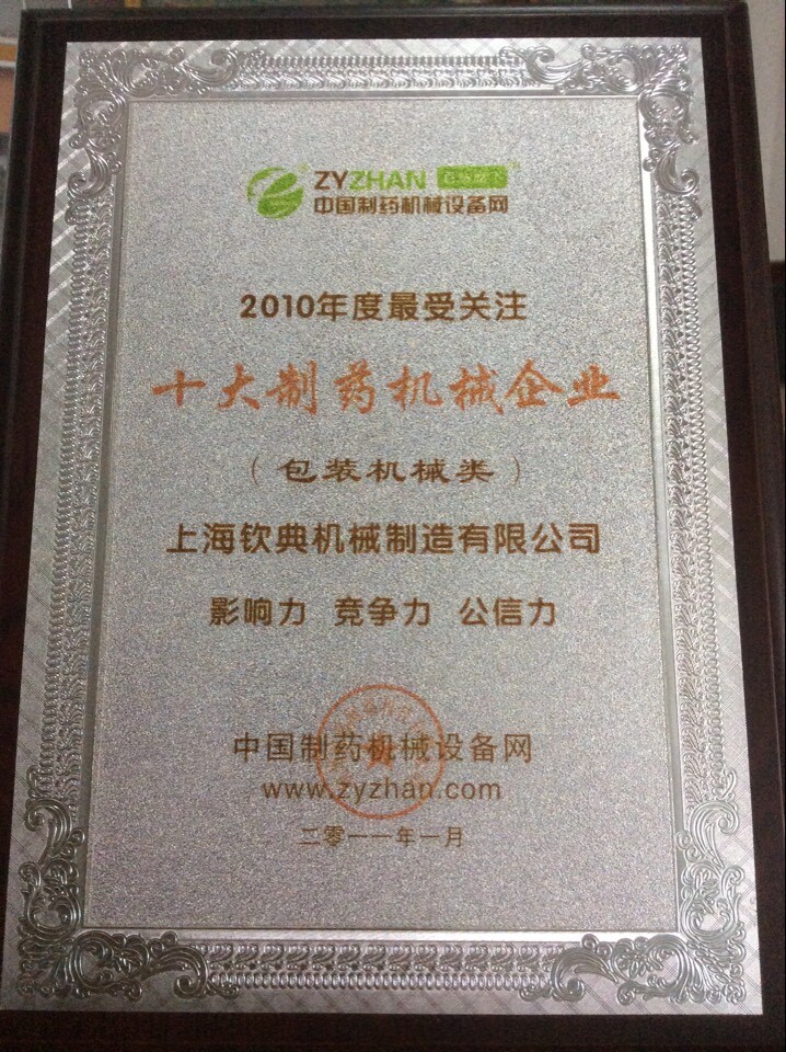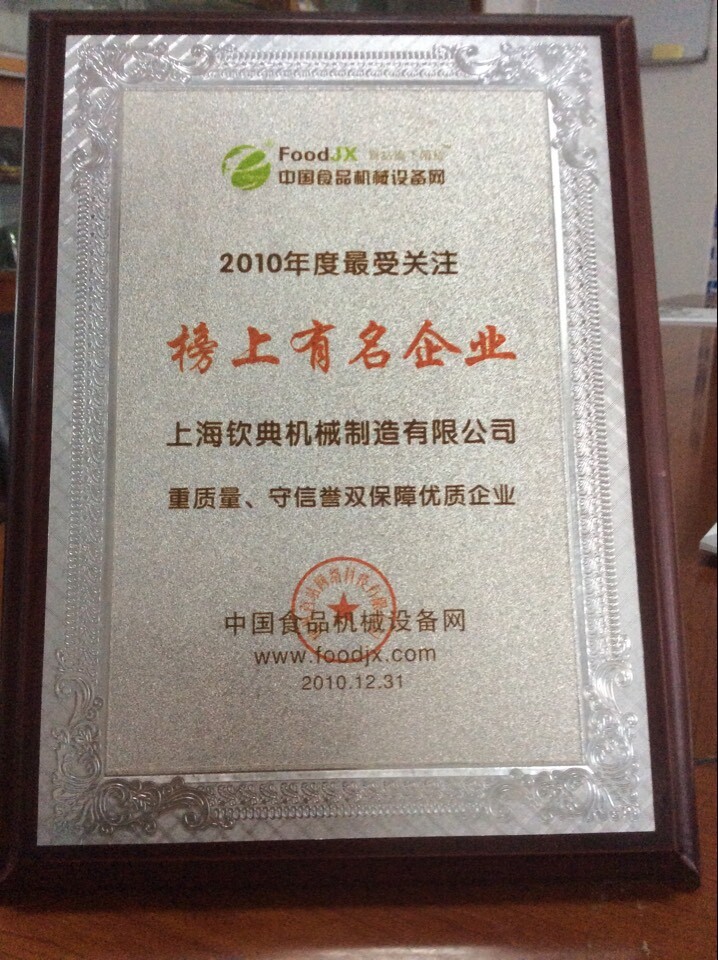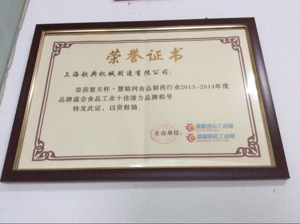 慧聰網(wǎng)品牌盛會食品工業(yè)十佳潛力品牌稱號榮譽證書